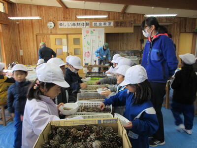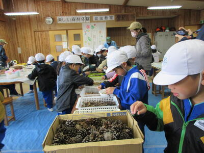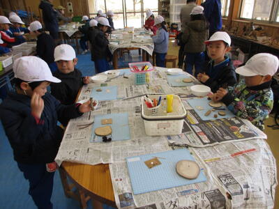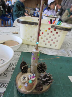 まずは、木工作の学習です。南湖森林公園周辺で採取した自然の物を使って、作品を作ります。