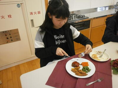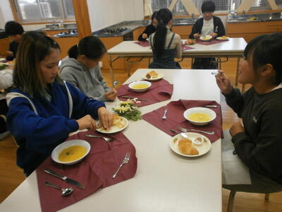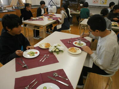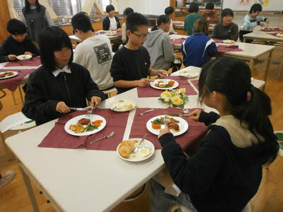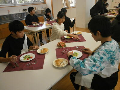 デザートのチョコケーキと牛乳で終了です。お腹いっぱいになりました。みんな学習したマナーを守って食べることができました。賑やかなところはご愛敬6年生らしい楽しい会食になりました。