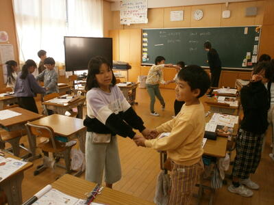 3年1組で音楽の鑑賞の学習をしていました。鑑賞曲は「ユモレスク♫」。ドボルザークの有名な曲で、バイオリンの響きが堪能できる曲です。また、A-B-A形式になっていて変化が楽しい曲です。今日は、この形式の違いを体で表現していました。