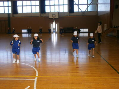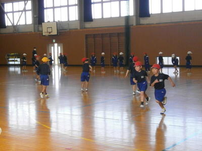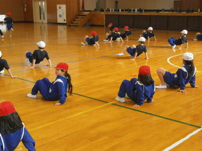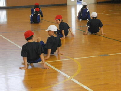 今日、1年生は体育館で体育の学習をしていました。どの学年も体育の最初に行うのが準備運動+「運動身体づくりプログラム」です。 「運動身体づくりプログラム」 は, 体力向上だけでなく, 体育の諸目的を視野に入れ, 「動ける」 「動きたい」 を合わせ持った身体を育てるプログラムです。