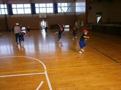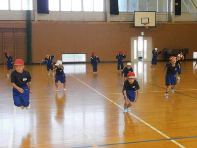 クロスステップなど、 福島県の子どもの実情を考慮して,、リズム感覚や 腕支持感覚などの育成を重視したプログラムとなっています。楽しく身体を動かしていきましょう。