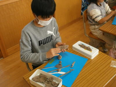 3年1組では、図工の学習で粘土の製作活動に挑戦していました。お題は『切って かきだして くっつけて』。