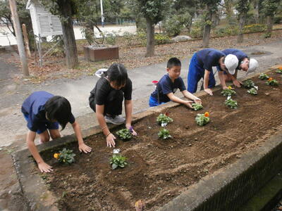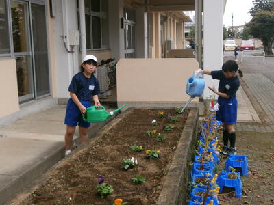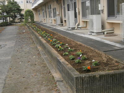 今日4年生が、らんらんボランティアの一環で花壇にパンジーを植えてくれました。