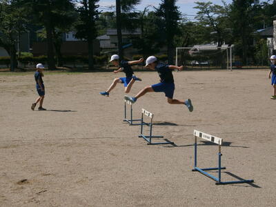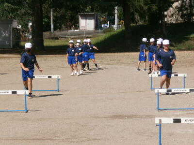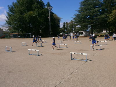 4年生が体育の時間にハードル走の練習をしていました。ハードルをリズミカルに跳ぶことがポイントになります。