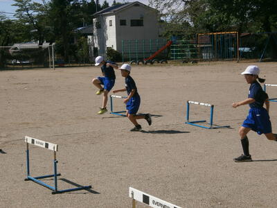 4年生は小型のハードルを使い、ハードル走に慣れていくことが高学年につながります。