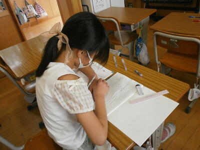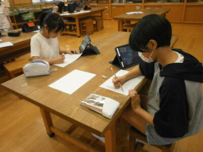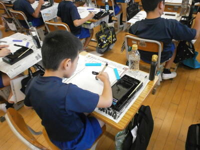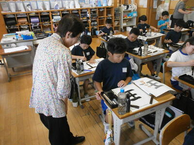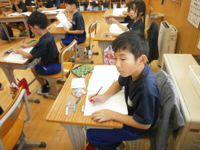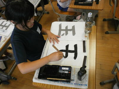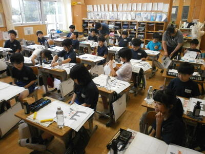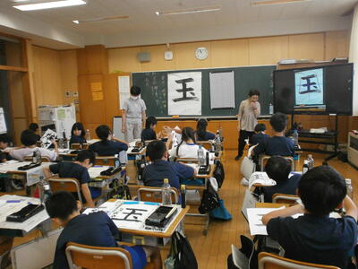 今日は、書写指導の先生においでいただき、秋の郡作品展にむけての練習を行いました。3年生は『玉』という文字が課題です。3の2でご指導いただきました。