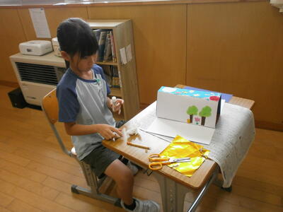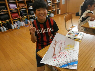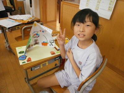 絵を立てる???この言葉だけを見ると不思議な感じがしますが、3年生の図工では、絵を立体的に仕上げる作品を作っていました。3の1の子どもたちは、このような作品を作っていました。