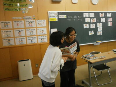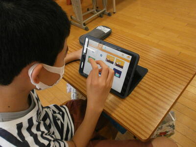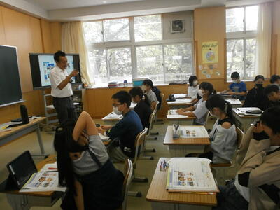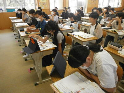 タブレットを活用して自分で調べたり、ALTに質問したり、友達と確認し合ったりして今日の学習を進めていました。