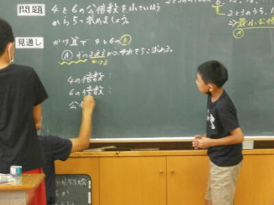 5年生が算数の学習で「公倍数」について学習していました。数の倍数を見ていくと分かりそうだけど…みんなで考えます。