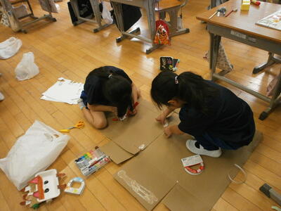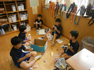 友達と協力しながら、箱や紙コップなど家や学校にある物を使っておもちゃを作ります。どんなおもちゃができるか楽しみです。できたら学級のみんなで遊ぶそうです。