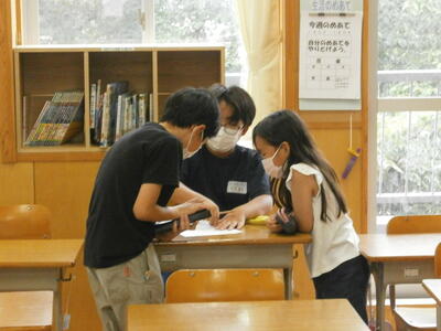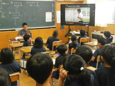 3年生は、次に行うバレーボール型ゲームのやり方を動画で確認していました。