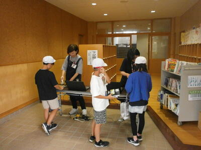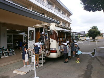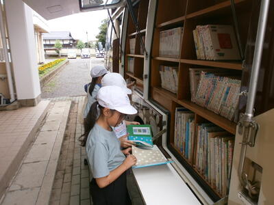 今日の業間は、町図書館の「よむよむ号」がやってきました。子どもたちは、夏休みに読む本を借りていました。