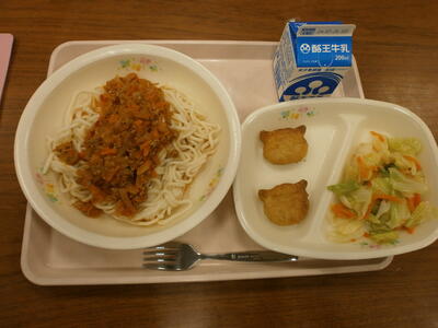 スパゲティミートソース、タコナゲット、フレンチサラダ、牛乳でした。