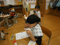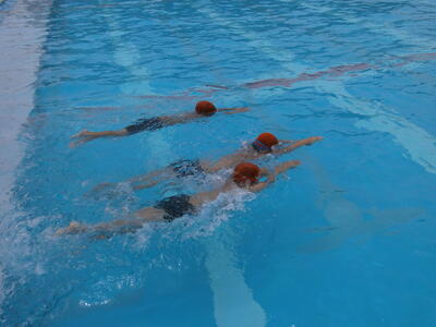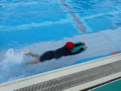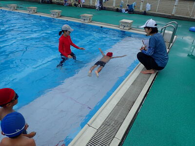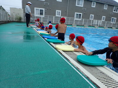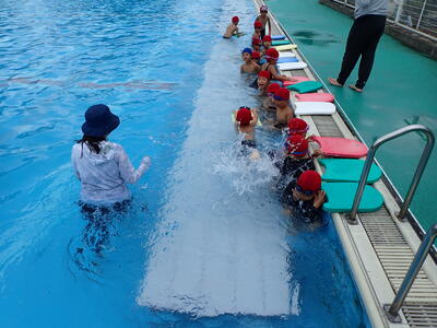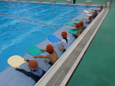 ビート板を使って25mのタイムを計ったり、ビート板なしで25mを泳げるか、またはクロールなどの泳ぎに挑戦したりしました。