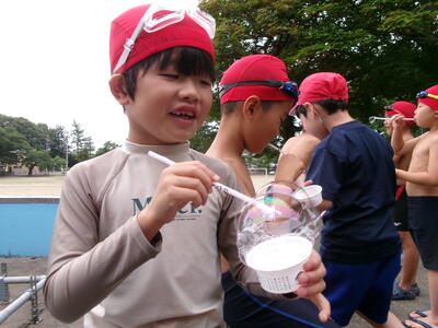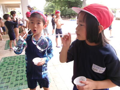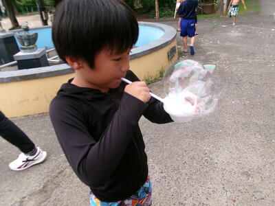 みんなでシャボン玉遊びを楽しんでいました。この後プールに入るので、水着の子どもたちも大勢いました。これからシャワーで洗い流してしまうので、少しぐらい汚れても平気です。