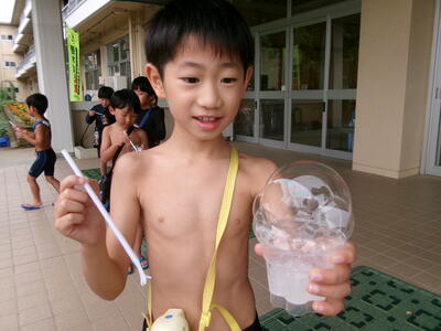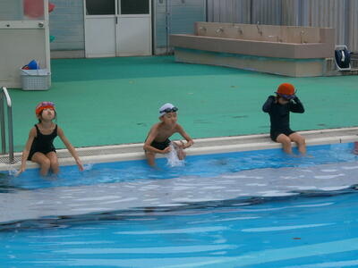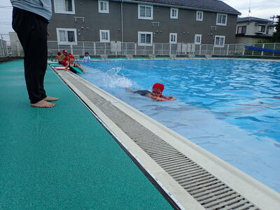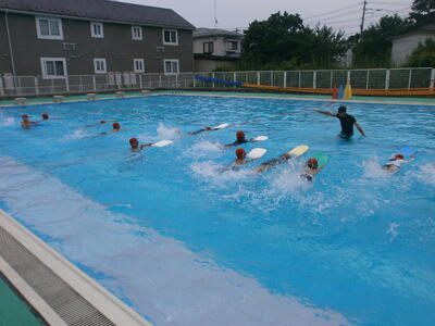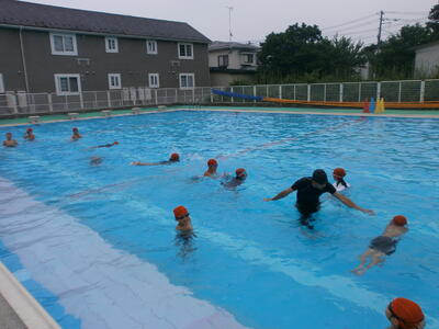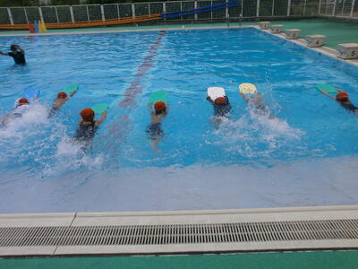 雲が多く、少しだけ雨が降る蒸し暑い天気でしたが、子どもたちは元気いっぱい。気温も水温も適温だったようで、気持ちよく水泳ぎをしていました。