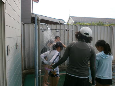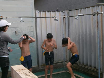 今日は1校時から5・6年生がプールに入りました。いつもは冷たいシャワーも気持ちよさそうです。