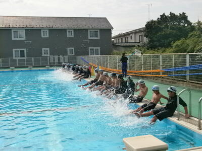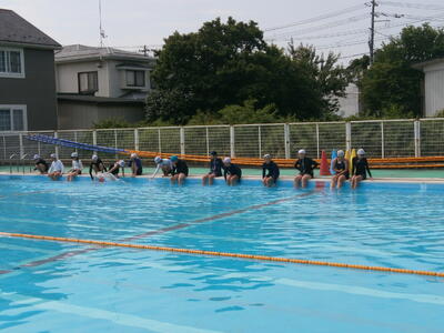 体をぬらしながら、徐々に水になれていきます。安全第一に指導を進めています。