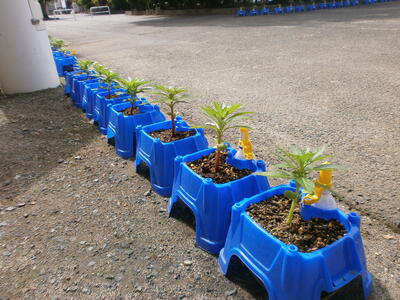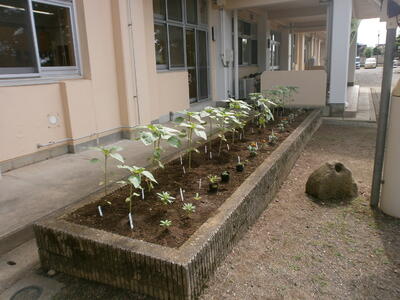 1・2・3年生が育てているあさがお、ミニトマト、ほうせんか、ひまわりなどの植物たちがすくすく育っています。