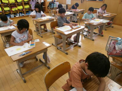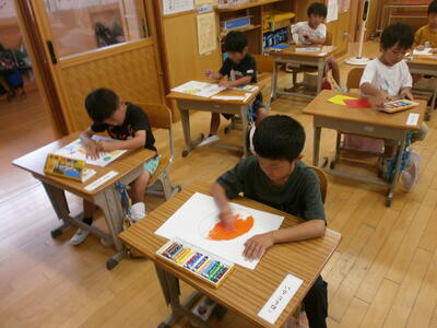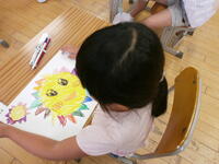 1の2は、クレヨンで太陽を描いていました。「ぼくの太陽ができあがりそうです」「かわいい太陽を描きます」「カラフル太陽です」…素敵な絵がいっぱいです。