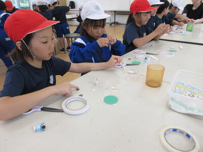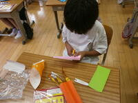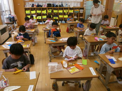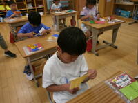 1の1は七夕の飾りづくりをしていました。「こんな風に切るとどうなるかな」「うまく切れました」上手にはさみを使って飾りを作る子どもたち…来週は7月ですので、七夕の願い事を飾りましょう。