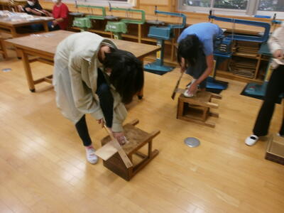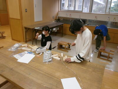 今日は、図工の学習で『木と金具でチャレンジ』という題材に挑戦していました。のこぎりにかなづち、ボンドに紙やすり…様々な道具を使って、木と金具を使った作品を作っていました。