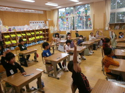 1年生は、それぞれのクラスで雨の日の過ごし方について話合いをしていました。