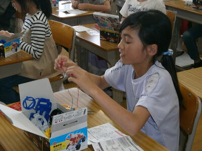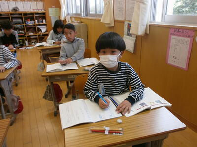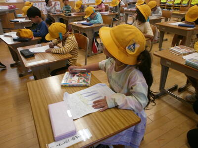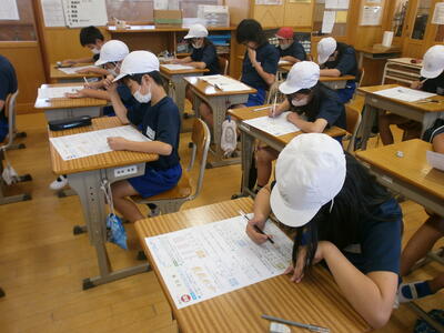 5年生が算数の時間に紅白帽子をかぶっていました。