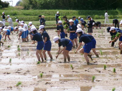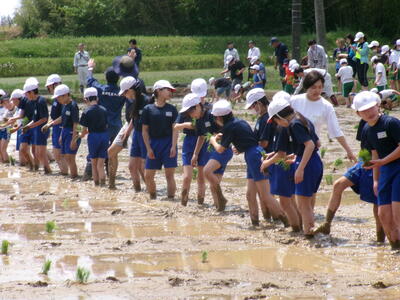 矢吹町では、有機農法に実験的に取り組んでおり、町内3校の小学生が苗植えと稲刈りに協力しています。今日は、実際に田んぼに入り、自分たちの手で苗を植えました。