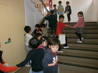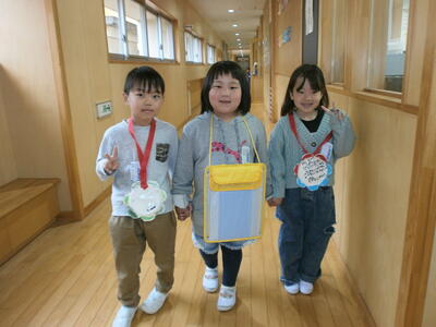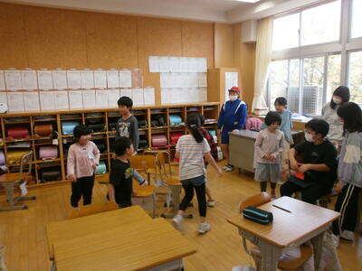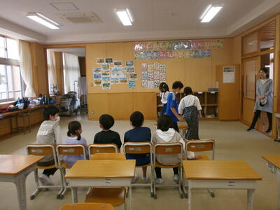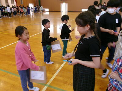 2年生が心をこめてつくったメダルとアサガオの種を渡し、学校案内をしてくれました。1年生はにこにこ、2年生はちょっぴり緊張の様子でしたが、「ここは職員室だよ」「6年教室に行こう」などリードする姿は、さすが2年生です。