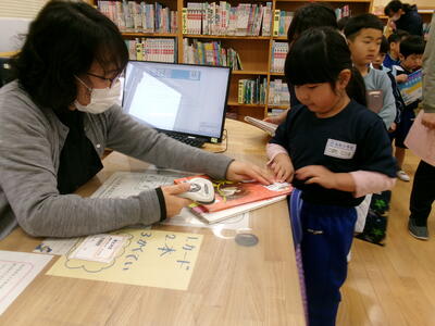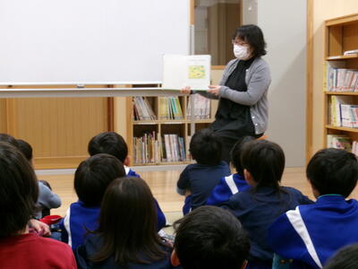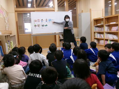 学校司書さんのお話を聞き、実際に本を借りてみました。小学校にはたくさんの本があるので、どれを読もうかとても楽しそうに選んでいました。今日は家読の日。ぜひご家庭で一緒に本を読んでみてはいかがでしょうか。
