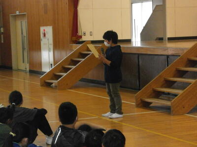今日は、1年生を迎える会が行われました。6年生を中心とした生活運営委員会が進行してくれました。(写真は、委員長の歓迎の言葉の場面です)