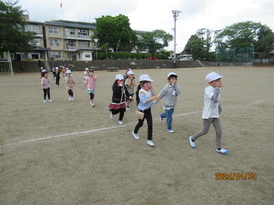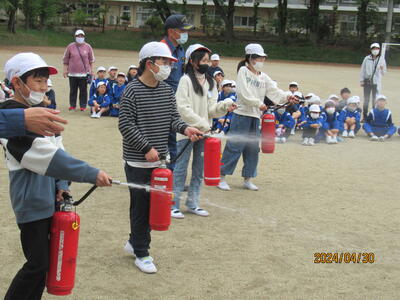 給食調理室から火災が発生した想定で、校庭に避難する形で訓練を行いました。