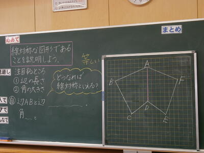 6年生は線対称の学習をしていました。教科書の図形をもとに、線対称について説明する授業です。