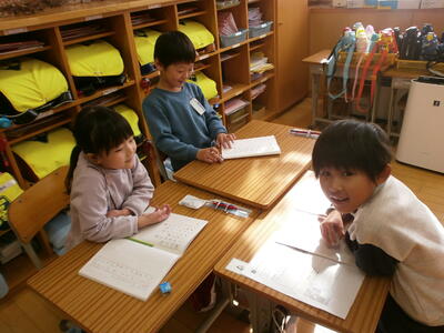 1年生がグループで話し合いをしていました。国語で学習した「おみせやさんごっこ」をいかして、お楽しみ会でおみせやさんごっこをするそうです。その準備の話し合いをしていました。