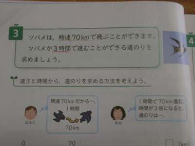 5年生は、速さ・時間・道のりの関係を確認していました。「はじかみ」で覚える子どもも多いですね。