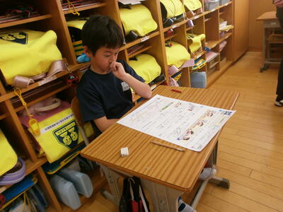 実際に物を売り買いするのではなく、文字を書いた短冊を売り買いする子どもらしいおみせやさんごっこです。自分で考えて楽しむ1年生…楽しそうなのが何よりです。