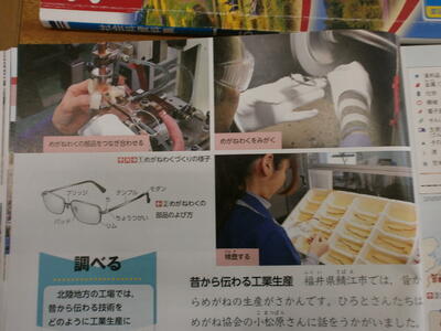 5年生の社会科では、日本の工業について学習しますが、今日はめがね枠の国内生産の90%以上が福井県で、その中心となる鯖江市では地域ブランドをつくっていることを学んでいました。