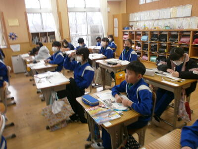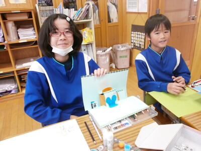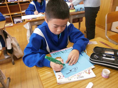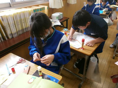4年生が図工の時間に飛び出すハッピーカードを作っていました。時節柄、クリスマス関係のカードが多く見られましたが、誕生日カードやがんばれカードなど、それぞれ工夫して作っていました。