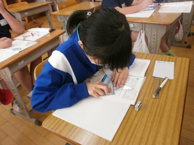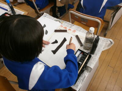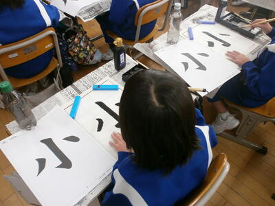 3年生の毛筆の学習では「小」という文字を書いていました。とめ、はね、はらいを学習できる文字です。教頭先生に一画ずつ確認してもらいながら書いていました。以前に比べると、筆の使い方が上手になってきました。形も上手に書けている子が多いです。習うより慣れろですね。