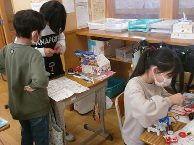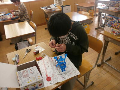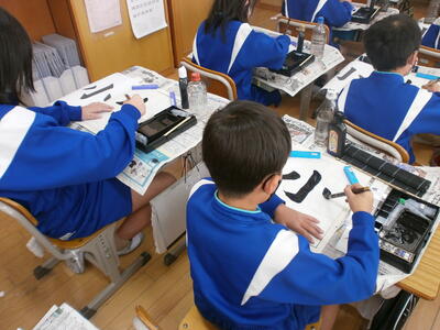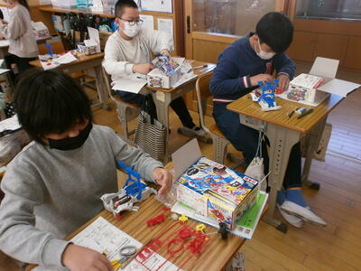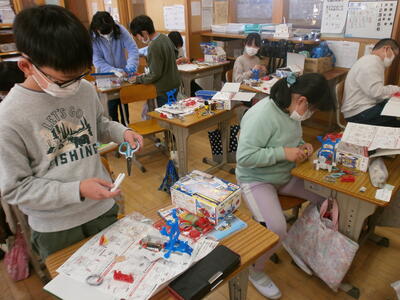 5年生の理科で、「電流と電磁石」の学習をいかしてモーターカーづくりに取り組んでいました。コイルまきやスイッチづくりなど、様々な工程を経て走り出します。子どもたちは自分の頭と手を使って作りますが、時には先生や友達の協力を得ながら作成していきます。協力体制が整っているのが5年生の良いところです。車が走り出すのが楽しみですね。