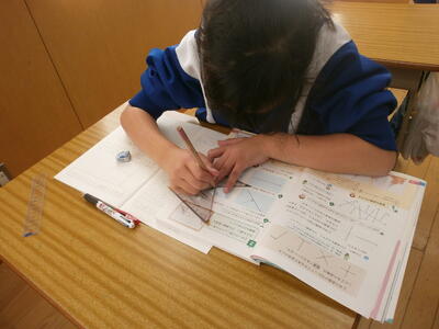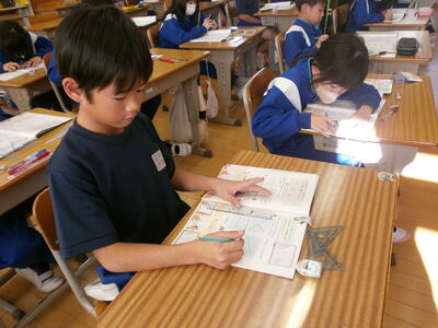 三角定規を使いながら、垂直の線を引く4年生の子どもたち…。