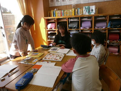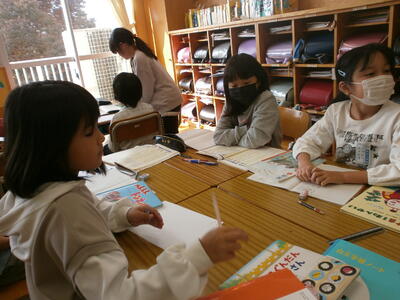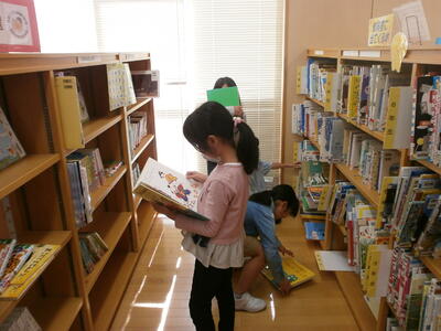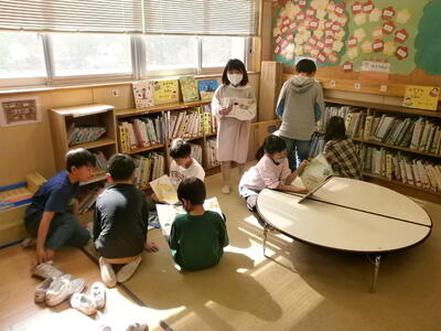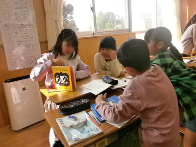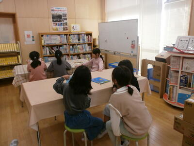 今日は、話し合いをする前に読み聞かせをしたい絵本を選びました。子どもたちは1年生が喜んでくれそうな本を一生懸命探します。選んだ本を早速読み聞かせする子どもたちも…。明日からどの本にするか班で話し合いをします。