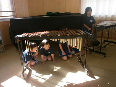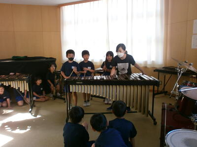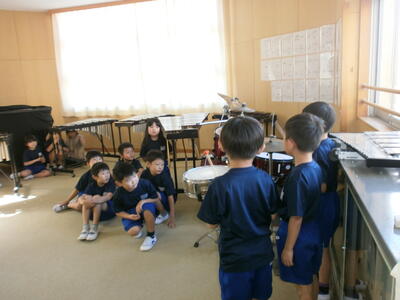 シンバルの音、マリンバと木琴の違いなど、実際に音を聴いてわかることがあります。それぞれの班に分かれて上手に紹介する姿も見られました。国語の力も付いていますね。