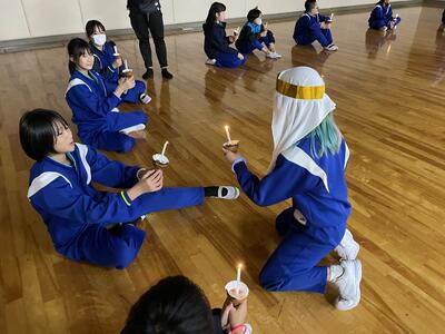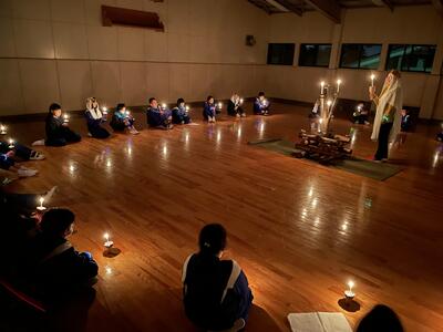 おまちかねの夜の活動。悪天候のためキャンドルファイヤーに変更となりましたが、楽しく、そして静かに夜が更けていきました。