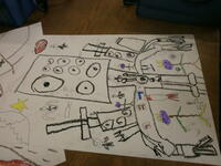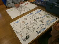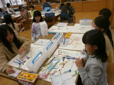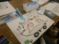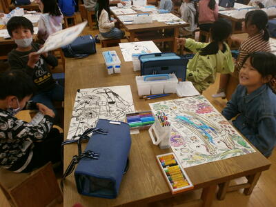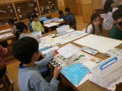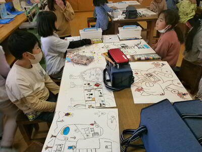 3年生が、創造を膨らませて不思議な乗り物を描いていました。発想がおもしろく、楽しい乗り物がいっぱいです。教は着色に入ります。先生の話を聞いて、すてきな作品に仕上げていきましょう。
