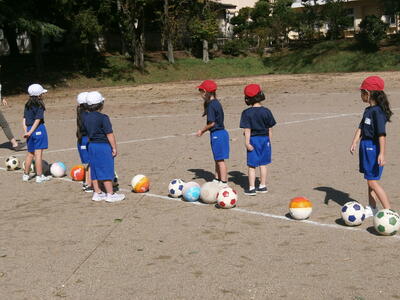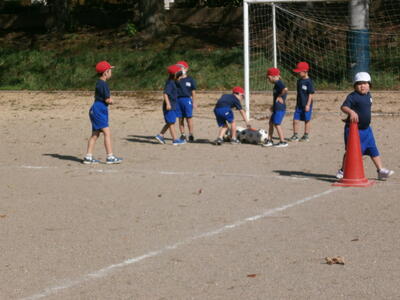 1年生がボールけりゲームを楽しんでいました。紅白に分かれてボールをけったり、ボールをキャッチしたり、運動量の多い活動にも元気に取り組んでいました。今日は秋晴れ!!ボールと仲よくなれたかな。