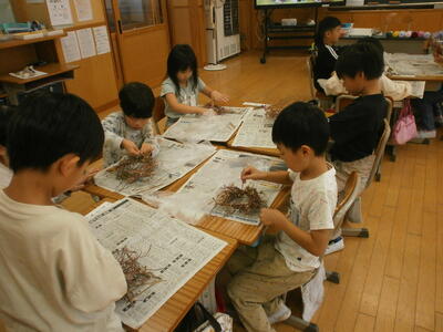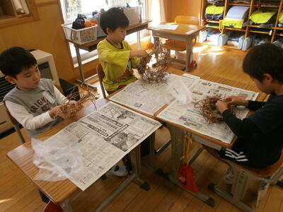 なかなか上手くいかないところもあっても、自分でやってみることが大事です。でも、1の1の子どもたちは上手にリースの形を作っていました。やればできるですね。
