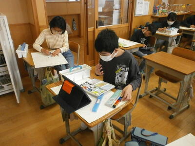 友達と相談したり、タブレットで参考にするモチーフを見つけたり、自分のペースで黙々描いたり…6年生は、自分で選択する力ができています。素晴らしいですね。