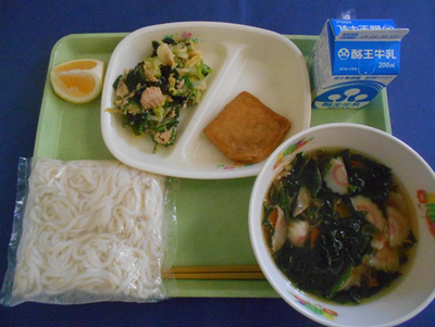 力うどん 牛乳 もちいなり わかめとツナのあえもの ニューサマーオレンジ